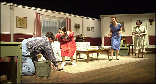Leroy (Billy Brisley, left) trying to clean up the water he 'accidentially' spilled on Rhoda's shoes as Christine (Liza Harris) and Mrs. Breedlove (Hannah Hendry) look on.