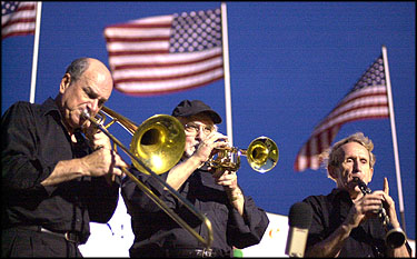 Chase Acito, Trombone; Leo Ball, Trumpet; and Bob Miller, Clarinete; perform some Dixie Land Jazz. (right) The fireworks explode over Gardner Field. (left)