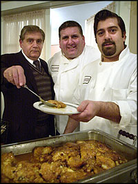 (below left) Andy Zeris; Richie Boralsky; and Steve Zeris, of Chrisandis Restaurant, Mountain Lakes serve "Chicken Saganaki". (below right)