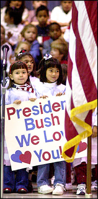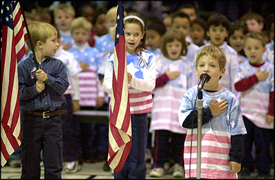 the school's kindergarten through second grade children and their teachers sang a song of "love, and hope, and joy" to parents, guests, and invited dignitaries. The event was planned to honor America and pay tribute to those lost in the tragic events of September 11. Following the program students presented a check in the amount of $641 to the American Red Cross to be contributed to suffering children in Afghanistan, as the president had requested. A copy of the videotaped program will be sent to President and Mrs. Bush.