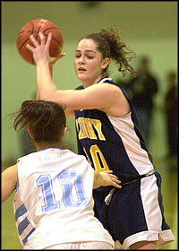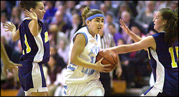 Roxbury #20 Laura Ahern, is covered by MC #10 Elizabeth Mascia. (above right) MC #14 Megan Olenowski drives past Roxbury #11 Nicole Irving and #15 Janel Cleffi. (left)
