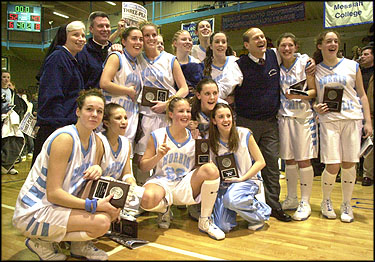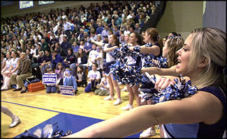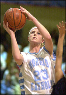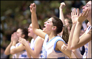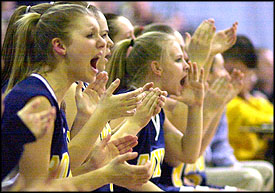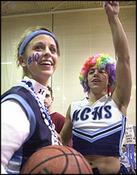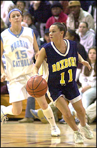 Morris Catholic fans. (right) Roxbury #11 Nicole Irving, gets past MC #15 Allison Dunn. (below left) Roxbury players cheer their team on. (below right)