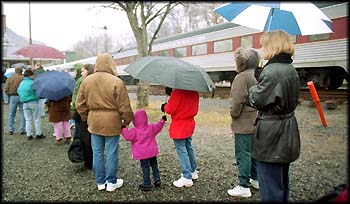(below right) Despite a steady rain, families line up to board the 45 minute Santa Train Ride from Whippany to Morristown.