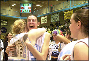 MC #15 Allison Dunn, sets up for a shot scoring 17 points for Morris Catholic. (top left) MC #33 Megan Eckerd and #42 Tara Kelly celebrate at games end. (right)