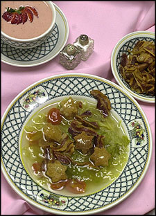 In a large sauce pan, combine water, clams and seasonings. Bring to a boil. Remove enough stock to cover potatoes. Cook potatoes. Place salt pork in