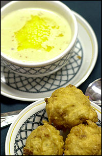 heavy soup pot, cook until partially rendered. Add onions and saute until transparent. Add flour, make roux, cook 5 to 6 minutes. Add clam stock to roux, stir until smooth. Add potatoes, clams, milk and cream.
