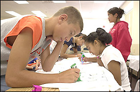 Ricky Thumar, takes compass readings as teammates Shane Aruzza, measures off the meters and Malay Amin, records their moves during an orienteering exercise. (right)