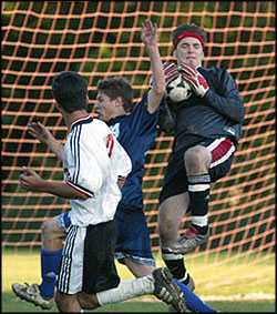 Boonton goal keeper Tim McKenzie makes a crucial save late in the second half on this shot by ML Matt Hipenbecker. (left)