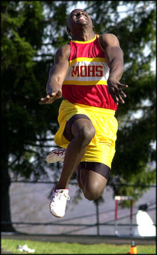 Morris Hills Brian Smith, finishes first in the 100 meter hurdels with a 15.2 run over Dover's Mike Steffen, with a 15.5 run. (right) Mount Olive's Josh Adieyefh takes to the air on the Long Jump.